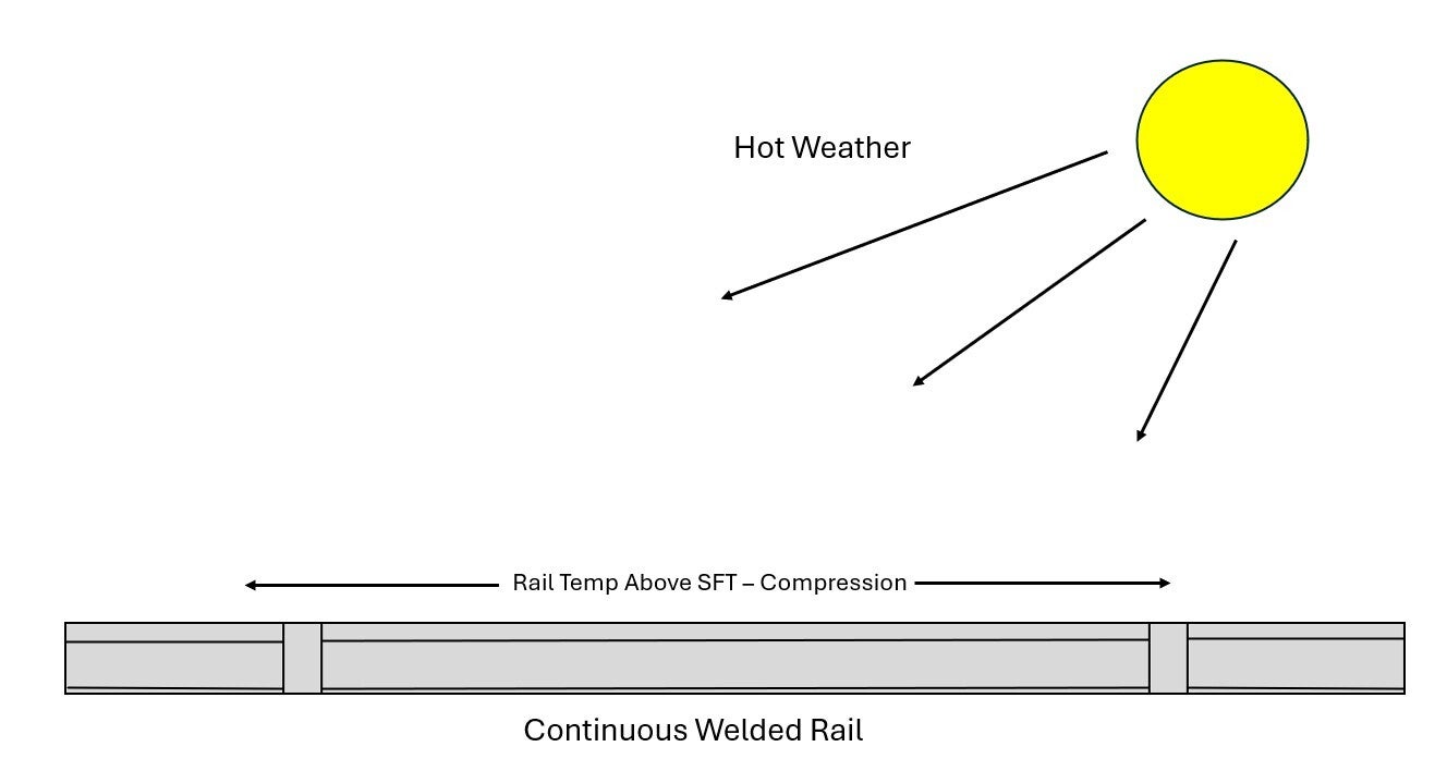 Steel expands when it gets hot. On the railway, that expansion is mostly locked in because the rail is restrained by sleepers, fastenings, ballast, and the formation beneath.
